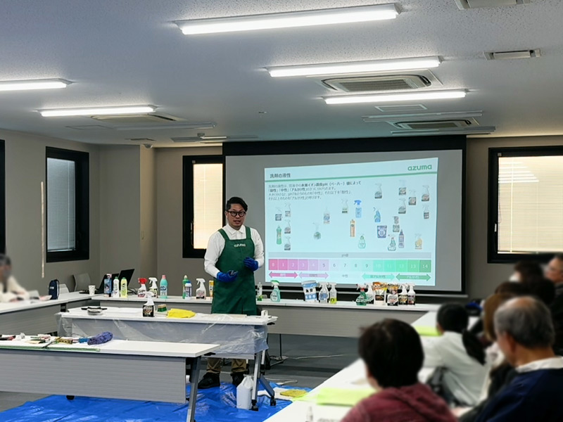 セミナーでは、洗剤の基本的な考え方をはじめ、玄関タイルの掃除やコゲ取りについてお話ししました。
